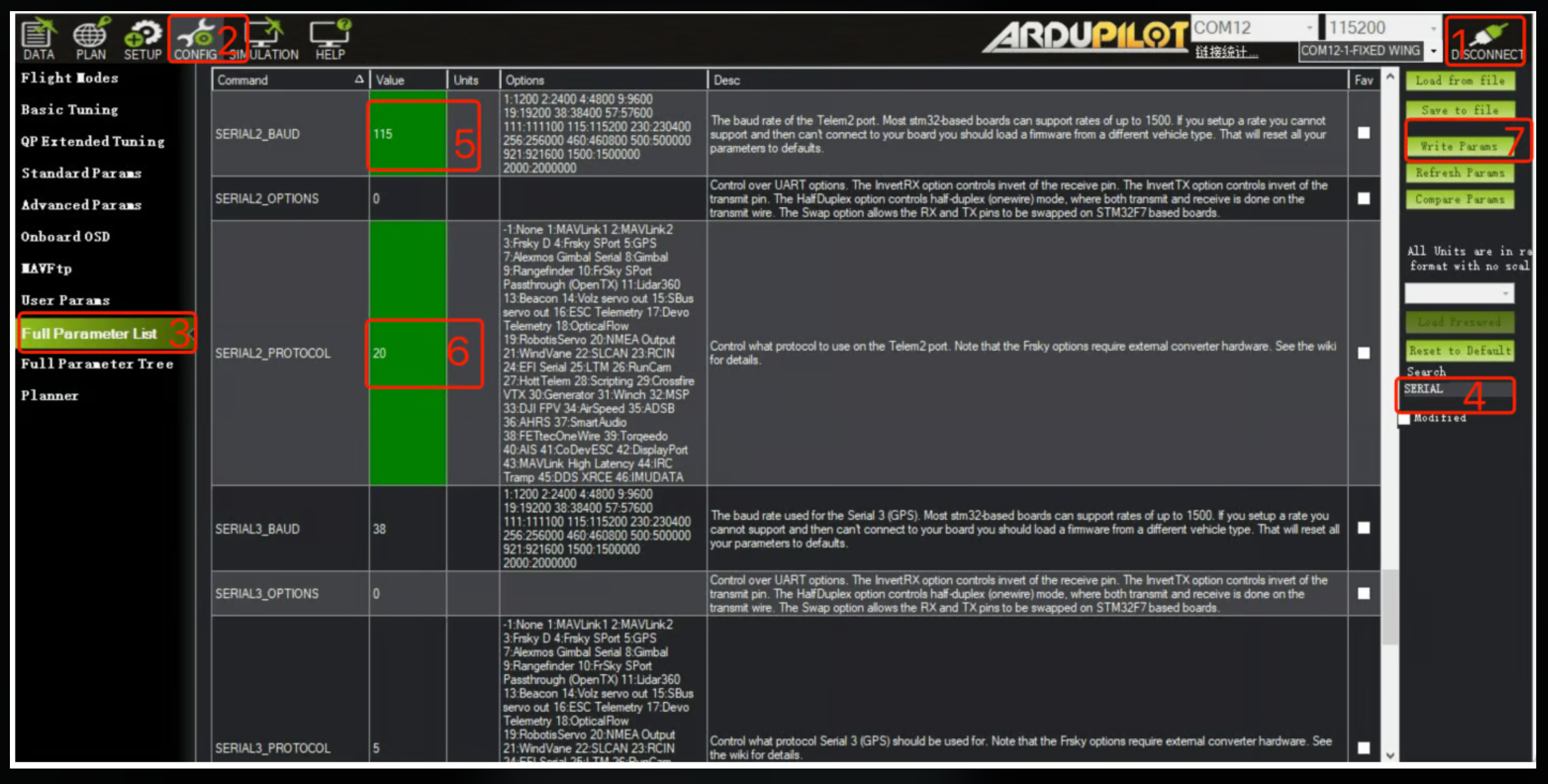 CommentShare feedback on the editorConnect the Pixhawk USB to the computer, open Mission Planner and click Connect, click on the CONFIG tab, select Full Parameter List, search for SERIAL_2 in the Search box on the right, after change parameters click the Write Params to save the settings.CommentShare feedback on the editorBelow is an example of the Ardupilot plane 4.4.4 firmware: