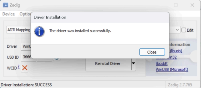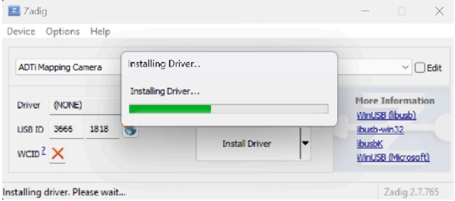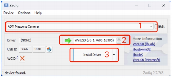to start installing the driver, it will recognize all the current USB devices, please select ADTi Mapping Camera in the drop-down menu , and then select WinUSB(v6.1.7600.16385) in the right side of the green arrow, then click Install Driver.