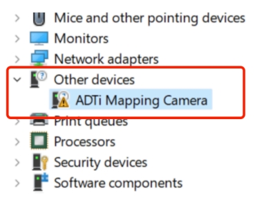 When you access the ADTi camera for the first time, you will see other devices that are not driven under the Device Manager, the device name is ADTi Mapping Camera, as shown in the figure below.