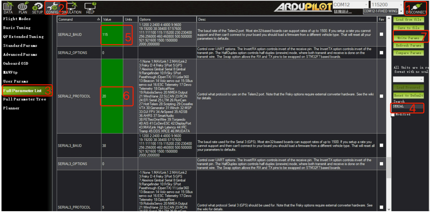 Connect the Pixhawk USB to the computer, open Mission Planner and click Connect, click on the **CONFIG tab**, select Full Parameter List, search for **SERIAL\_2** in the Search box on the right, after change parameters click the Write Params to save the settings.